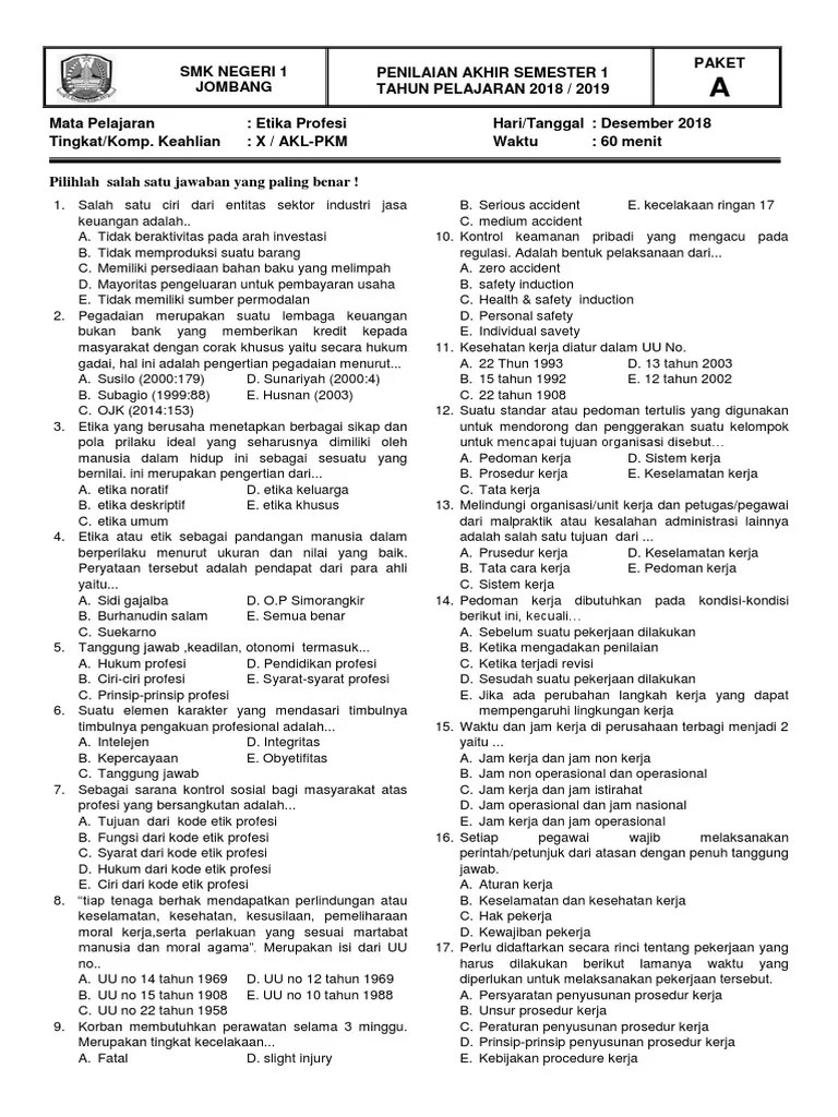 Buku paket akuntansi dasar kelas 10 guru ilmu sosial. Pertautan antara standar kompetensi satu dengan lainnya, tentu saja akan. Latihan soal sma ma ips kelas 10 bahasa inggris ips chapter 12 latihan soal. Guru sd smp sma contoh soal komunikasi bisnis smk kelas 10. Soal essay pkn kelas 12 beserta jawabannya business plan. Berdasarkan pengukuran angket ahli media, yang dilakukan kepada dosen ahli media dengan tujuan mengetahui kelayakan media pembelajaran pada mata edmodo pelajara etika profesi materi analisis akibat kecelakaan kerja dengan perolehan skor 3,6 dalam kriteria penilaian sangat baik. Feb 15 2019 download contoh soal etika profesi smk kelas 10 essay pilihan ganda dan kunci jawaban. Langsung saja cek soal dan jawabannya dibawah ini ya. Buku kelas 10 smk etika profesi dan profesional bekerja 1 gratis download untuk pelajar guru seluruh indonesia. kelas 10 smk etika profesi dan profesional bekerja 1 (1) etika profesi dan profesional bekerja. Buku ini merupakan buku resmi yang diterbitkan oleh pemerintah melalui direktorat pembinaan sekolah menengah kejuruan. Selanjutnya, kalian dituntut untuk mengusai konsep tersebut dengan latihan soal dan mengembangkannya untuk memecahkan masalah dalam komunikasi secara digital, mata. 20190213 soal dan jawaban etika profesi pilihan ganda pilganetika profesi merupakan salah satu hal penting yang harus dimiliki oleh setiap karyawan.
